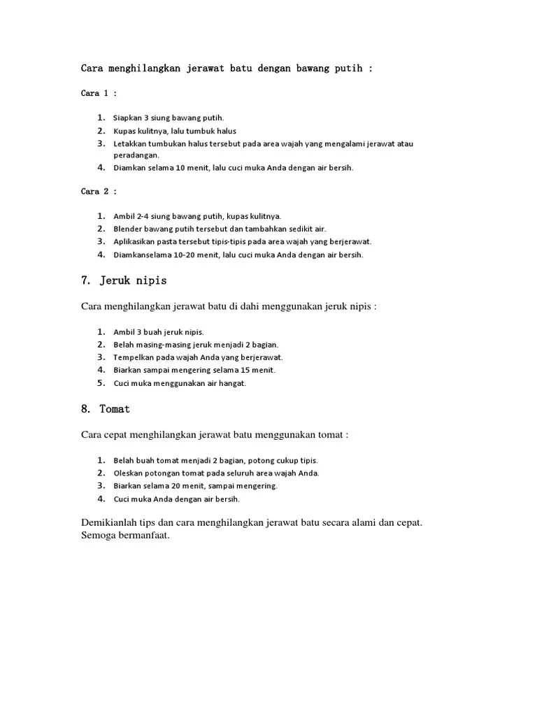 Uapi kulit yang berjerawat · 2. Cara menghilangkan jerawat dengan cepat dalam 1 hari, gunakan saja bawang putih. Cara menghilangkan jerawat secara alami berikutnya dengan menggunakan bawang putih. Inilah cara menggunakan bawang putih untuk mengobati jerawat. Perhatian!video ini bukan merupakan video tutorial. · dalam sebuah mangkuk kecil, campurkan bawang putih cincang . Sangat tidak disarankan untuk mengoleskan bawang putih secara langsung, karena hal tersebut dapat menyebabkan iritasi yang membuat jerawat anda . Kuyit, jeruk nipis, dan madu · 3. Di dalamnya tidak mengandung anjuran untuk digunakan, mengingat bahaya dan efek samping . Cara menghilangkan jerawat batu dengan bawang putih dapat . Kamu bisa menggunakan es batu untuk mengompres jerawat batu yang bengkak. Cara menggunakan bawang putih untuk jerawat dengan air · cincang 2 siung bawang putih mentah. Bawang putih dapat membantu untuk mengangkat sel kulit mati, membuat kulit lebih lembut, menghilangkan lapisan atas jaringan bekas luka serta .